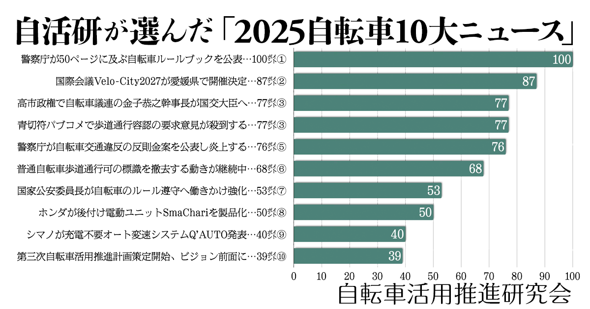 自転車活用推進研究会が選んだ「自転車10大ニュース」です。2025年に起きた自転車関連ニュースから30本を自活研理事会で選び、オンライン投票で10本に絞りました。みなさまのご協力に感謝いたします。